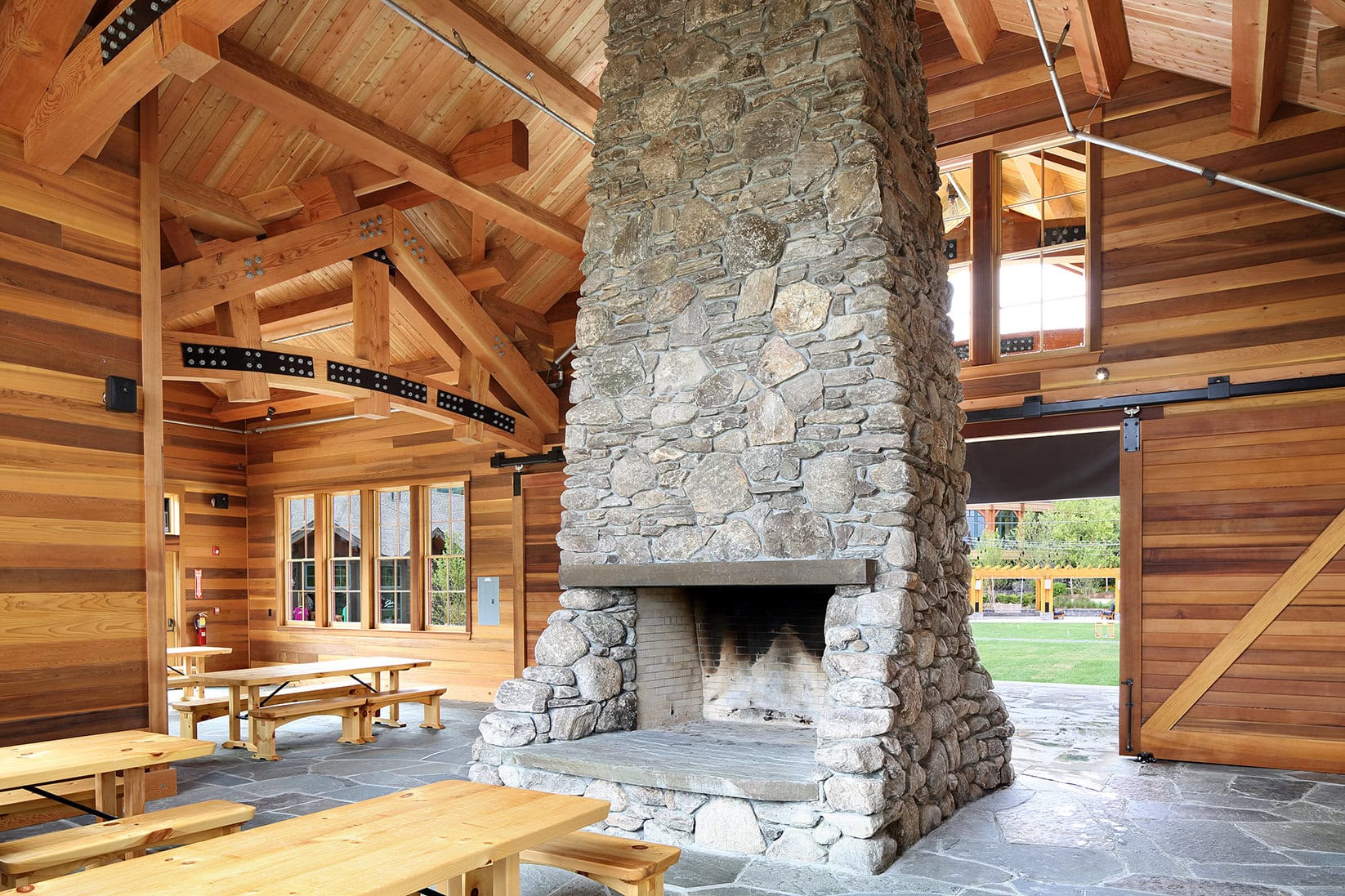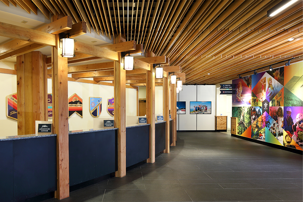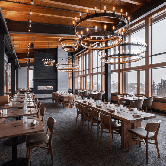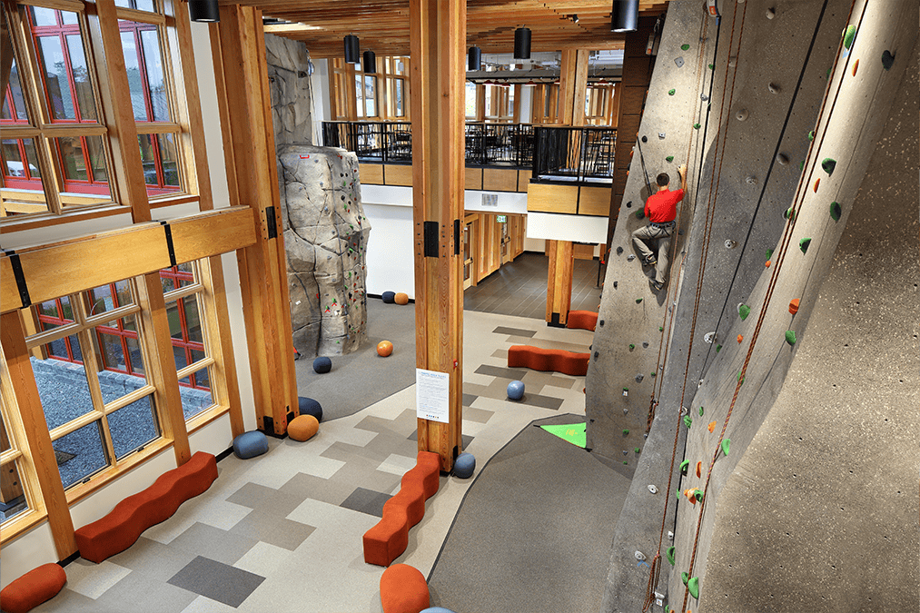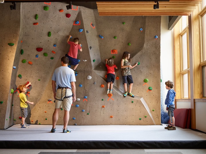 The Spruce Peak Adventure Center serves as the base for Stowe Mountain Resort’s year-round children’s activities. The Center features a three-story climbing wall and bouldering area, theater, arcade, café, and resort’s daycare. The 29,000 square foot facility features flexible multi-use spaces that evolve throughout the day and from season to season. The center’s boot-up area adapts into a movie theater with benches that convert to lounge seating. The Canteen serves as the ski school food service in the winter and converts to a teen hangout by day and family dining experience in the evening and the shoulder seasons. The building’s dynamic floor to ceiling windows highlight the activities inside and their relationship to Stowe’s majestic outdoor environment.